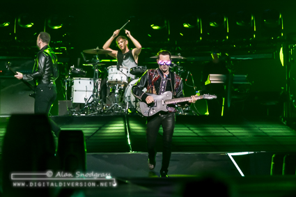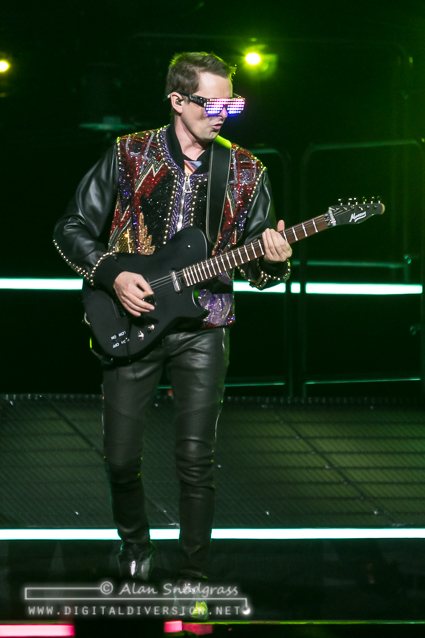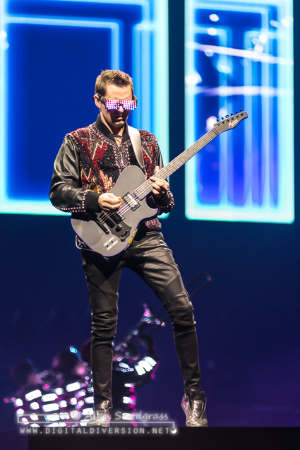 Doubling down on the space rock theme, the set kicked off with the band seeming to be “beamed” down to the stage while a squad of space trombonists marched their way to the end of the catwalk where frontman Matt Bellamy rose through the floor with mic in hand.