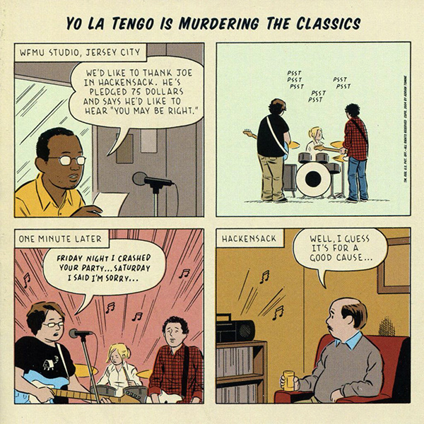 One of the things that amazes me most about Yo La Tengo Is Murdering the Classics is the band’s seemingly encyclopedic knowledge of rock music. Most people could bang out a cover of “Sea Cruise” or “Downtown” or “Route 66″ or “Roadrunner” or “My Sharona.” But NRBQ’s “Captain Lou”? The truly obscure “Baseball Altamont” by the Nightmares? The Bonzo Dog Band’s “Mr. Apollo”? The theme song from the 1960 Jules Dassin film Never on Sunday? “Never on Sunday” is not “The Hokey Pokey,” people, although you should hear what Yo La Tengo does with “The Hokey Pokey,” namely turn it into a cool country shuffle. I love the part where Ira Kaplin (who wants the band to join in) shouts, “Everybody!” Pause. “I SAID EVERYBODY!”