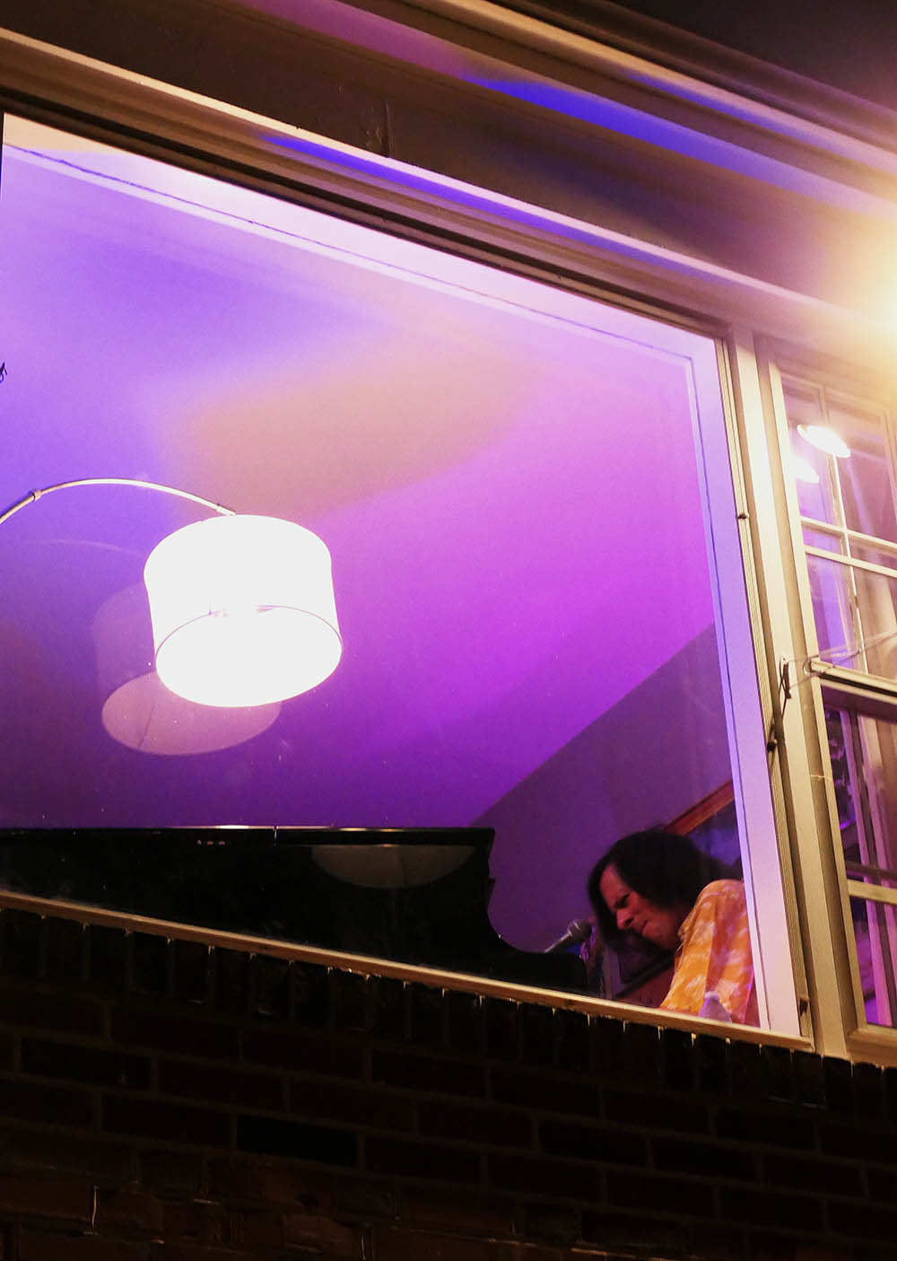 At the front of the room is Ken’s improvised stage rig, which features “a real piano” (as promised by the tour webpage) against the tastefully space-age backdrop of a dark window to the backyard which reflects both the mood lighting in the living room and the neon violet glow of the WiFi router. Ken cracks a joke about this unexpected special effect between tunes—a moment which epitomizes the appeal of a private concert. There might not be much room to move, but there’s plenty of room to breathe, and Ken uses that freedom to great effect.