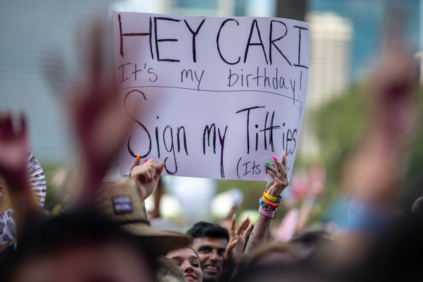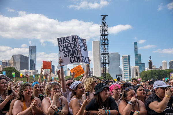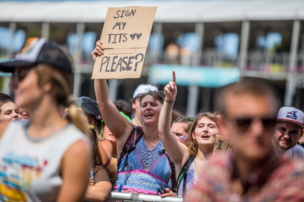 3:16PM: I have never seen so many boob-related signs. Fletcher’s crowd is divided: some signs request that Fletcher show her boobs, while others would prefer she autograph their boobs. It’s no doubt a memorable crowd for the pop singer’s first time playing a main stage at a festival.
