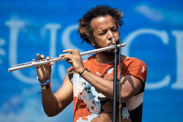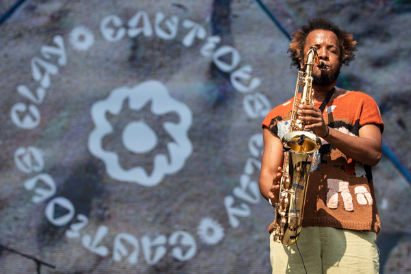 3:54 PM Two songs into his set and Cautious Clay has shown he’s multitalented. Aside from lead vocals, he plays the flute and saxophone.