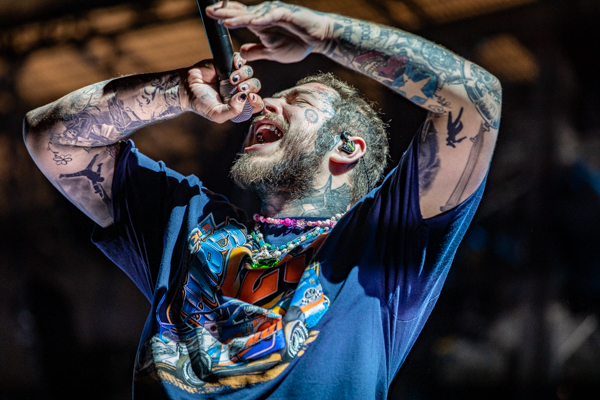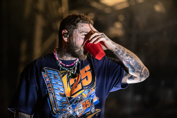 9:16 PM Trusty red solo cup in hand, Post Malone smiles big and takes in the view of the field. He’s grateful to be performing in front of people again and they’re just as grateful to watch him bouncing around the stage.