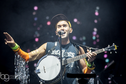 I’ve been steadily going to his concerts since 2006 and he’s always got something fun and playful up his sleeve. So I was already excited to see what he would do tonight. And here he is with his band, all clad in wild neon outfits, leaping around, and busting out choreographed dances. During the first song alone (“Seven Swans”), he grandly adorns himself with swan wings and smashes his banjo to smithereens. FUCK YES.