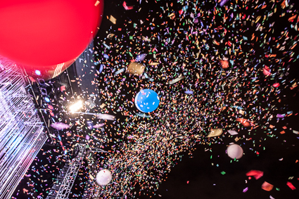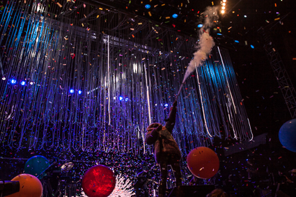 8:55pm: The Flaming Lips always put on a performance. “It’s like we’re inside a rainbow,” another photographer astutely described as balloons bounced off my head and rainbow confetti fell around us. “Oh Yoshimi,” Wayne Coyne sang as giant caterpillars swayed beside him.