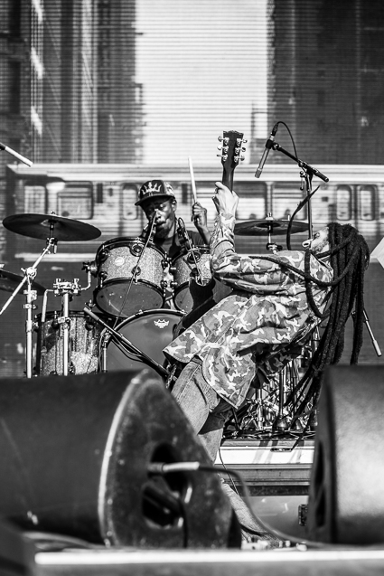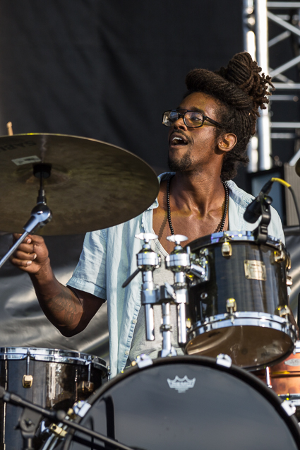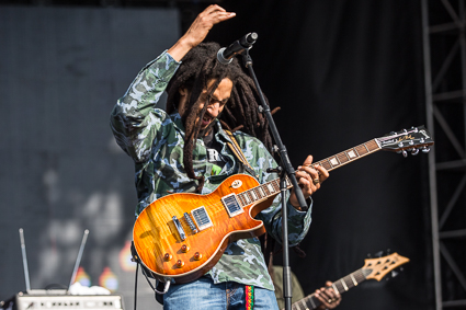 4:13pm: A steady haze of smoke rises from the crowd throughout Julian Marley’s set, most of which is devoted to covering his father’s seminal album, Exodus. The musical vibes match the scene, as the sun is settling into the golden hour.