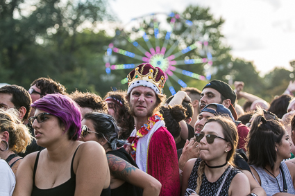 6:31pm: Dan Deacon is now having technical difficulties playing his second set of the day, this time in the tiny tent sponsored by StubHub. I use this as an excuse to hop on the ferris wheel at take some aerial photos of the scene.