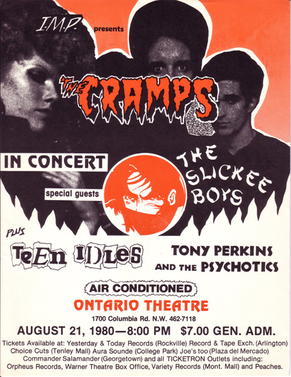 Beginning in the late 1970s, The Cramps developed a large cult fan base in Washington, DC for a variety of reasons: our proximity to NYC, true champions in the music press (Joe Sasfy, Howard Wuelfing), regular college radio play at WGTB and WMUC, simpatico bands to play with (Slickee Boys, Tex Rubinowitz), but most notably, a series of unforgettable performances at the LBJ Club, Psyche Delly, Ontario Theater, and the Hall of Nations at Georgetown University. The Cramps became one of our own, and to this day are credited with altering the musical paths of many lives, including yours truly. (Outrageous Music Festival at Warner Theater in May 1979, Root Boy Slim didn’t have a chance).