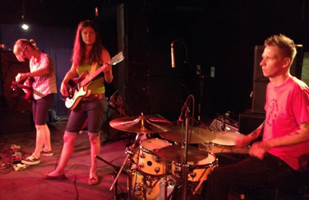 Olivia Mancini was playing guitar loudly and Kristen Forbes was playing bass in America Hearts. During Race Car Driver, Kristen climbed her bass amp onto my guitar amp and jumped off, knocking it over. Our favorite sound guy, Aaron Estes ran out and set it straight while gesturing as if “it happens all the time.”