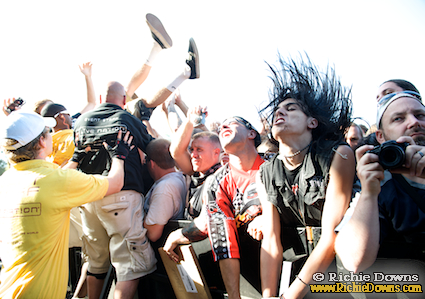 The Mayhem tour set up three different stages to host the onslaught of metal bands throughout the day. In fact, the stage setup at this particular event was one of the most impressive and certainly the most efficient setup I have seen from any all-day music event. The smallest of the three, the Sumerian Stage was set along the main walkway of the Pavilion grounds. This stage had a reach-out-and-touch kind of feel to it. Many fans stood at the barricade talking to artists before and after their sets. Because of its location, The Sumerian Stage actually seemed a little camouflaged amongst a line of vendor tents and mixed right in with various booths that sold anything from snacks to body jewelry to full-blown Slip-Knot-style face masks.