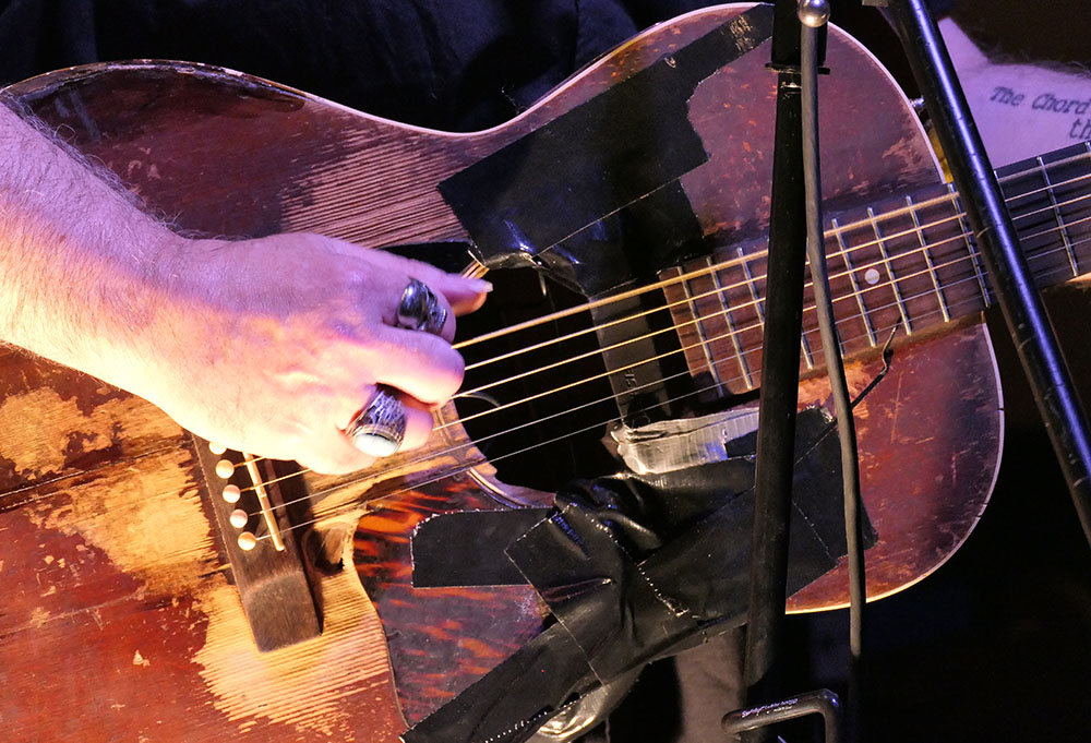 As Hamell warms up, the first thing I notice is the guitar. Hamell uses one guitar for the entirety of his roughly two-hour performance: a 1937 Gibson acoustic, immortalized in his tribute, “7 Seas.” Rigged with black tape and wired to an amp, the wood shows wear, she’s almost dust, and I wonder how much fight she has left in her. But she sounds incredible, warm and knowing, and I can hardly avert my eyes. Only the force of Hamell’s personality tears me away.