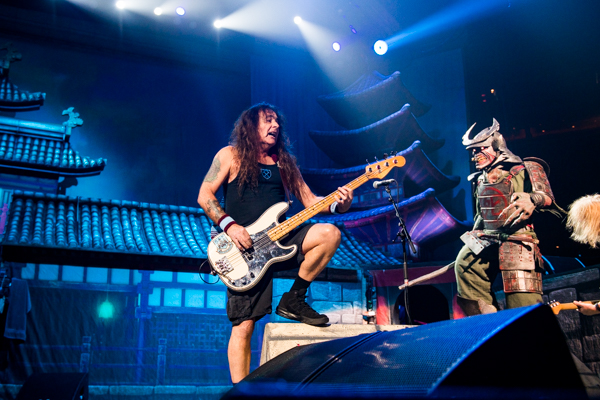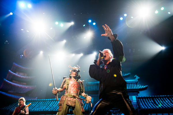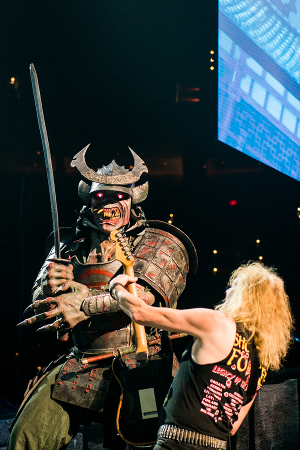 Iron Maiden wasted no time bringing their beloved mascot, Eddie to the stage to join his bandmates. During the very first song of the set, “Sanjutsu,” Eddie appeared in full Samurai armor wielding a blood covered sword. He took turns battling band members one by one before he retreated backstage. Not to worry though, Eddie would appear throughout the night in some form or another.