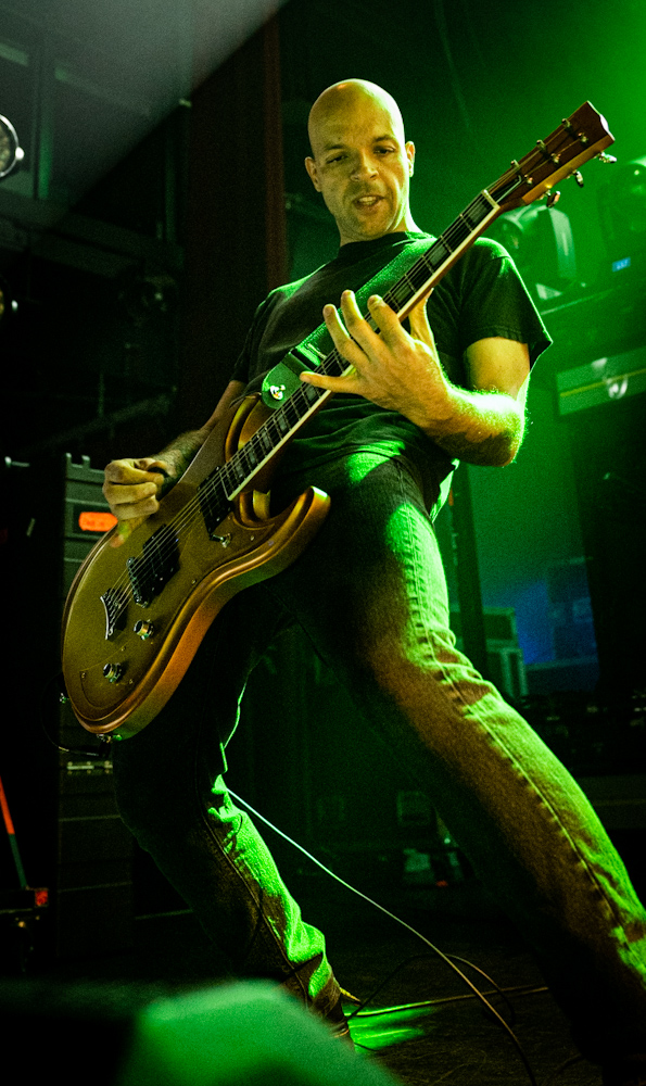 Tuesday night, the increasingly vocal crowd amused themselves by singing along to a compilation of metal tunes in the style of video game soundtracks. Finally, George Michael’s “Careless Whisper” filled the venue, signaling that the band would soon take the stage. One by one, Meshuggah (Jens Kidman, Fredrik Thordendal, Tomas, Haake, Mårten Hagström, and Dick Lövgren) appeared on the darkened stage, set against light boxes that lit the men from behind.