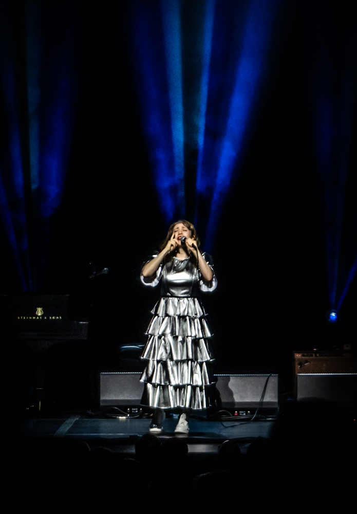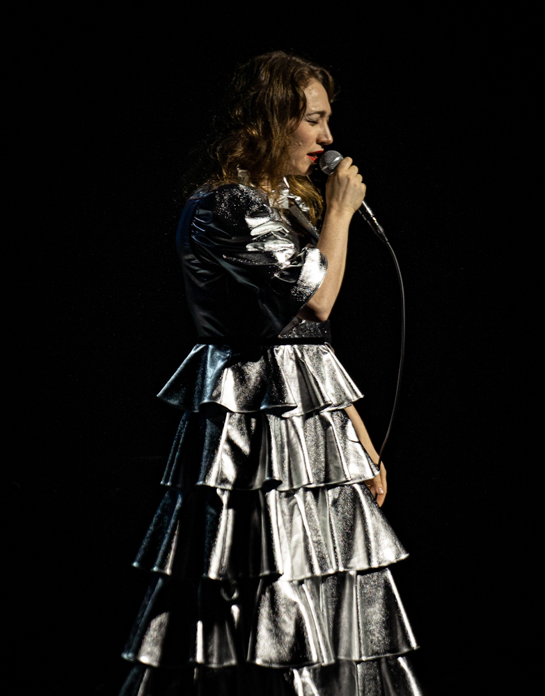 Spektor said at times she was rattled by the sheer beauty of the venue; she cracked that she’d be more comfortable in a dark, divey club. She seems far from those days, though. And her silvery many tiered gown would have been out of place. At Wolf Trap, it looked a little weird at first too, but as the show went on it was easy to see how well it reflected the changing colored lights above her—she was a one woman light show too.