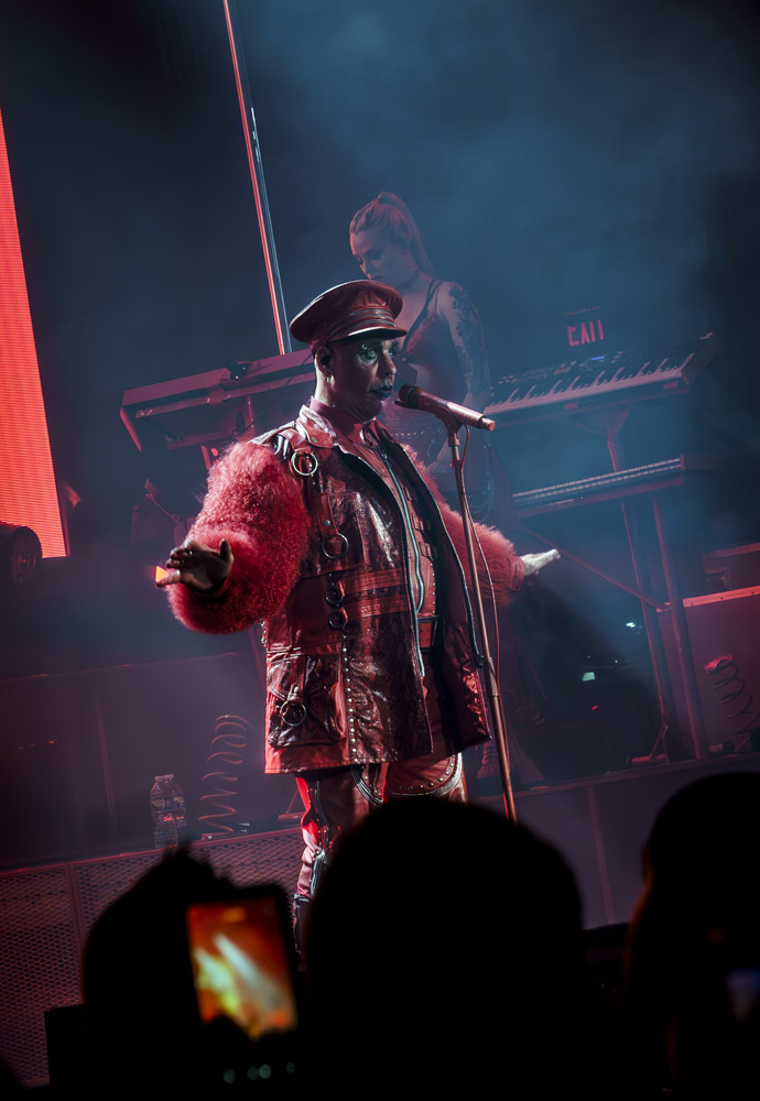 At 9PM on the nose, Lindemann took the stage in a red uniform that was one part military, one part Berlin bondage club. Accompanied by his backing band—guitarists Jes Paige and Emily Ruvidich, bassist Danny Lohner, keyboardist Constance Day, and drummer Joe Letz—Lindemann launched into “Zunge,” from the latest album.