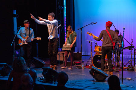 One song into the set, lead singer Unnsteinn Manuel Stefánsson implored, “We need to take down the barricades in the back. This is democracy!” While the crowd didn’t quite rush the stage, people did finally stand up, following the band’s instructions to jump in unison and from side to side. Retro Stefson has been together for seven years, and their newer work has a complex maturity to it. But the group’s oldest members are still in their early twenties, and their stage presence belies—or perhaps embraces—their age. The band is used to playing high schools, colleges, and the European festival circuit, and their sound is certainly ready-made for a rowdier scene.
