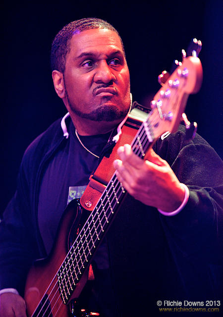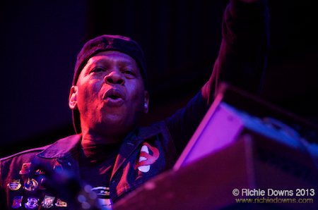 They were great, although Big Tony Perkins did way too much talking–I think he gave a shout-out to every single person in the audience except me: must be that damned square dancing certificate. They started their set with “Hey Fellas,” then went into “E Flat Boogie” with its great callout “T.R.O.U.B.L.E. flat boogie,” the percussion marathon going into full flow. Trouble Funk then brought Stinky Dink, aka The Riggity Raw One–a hip hop/go-go MC best known for the 2,000 odd versions of his 1991 hit, “One Track Mind”–for “Roll With It.” He promptly rapped his way into what else? “One Track Mind.”