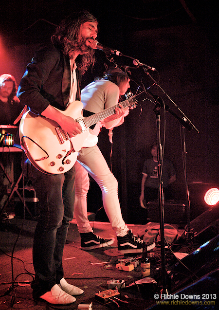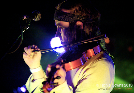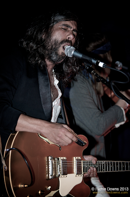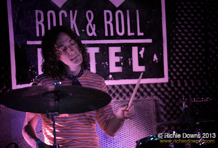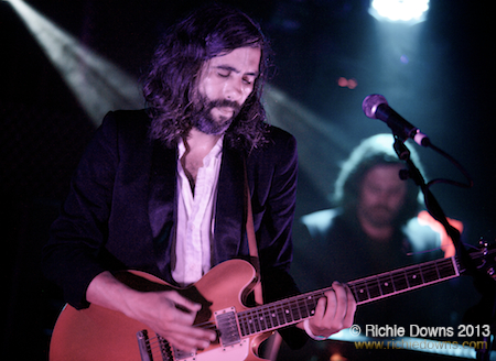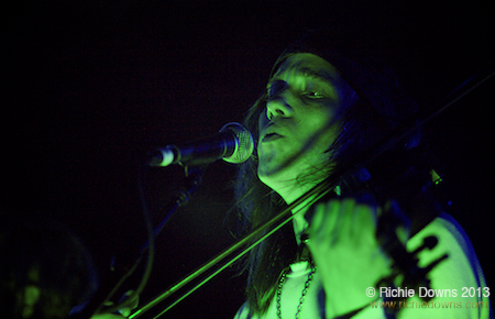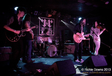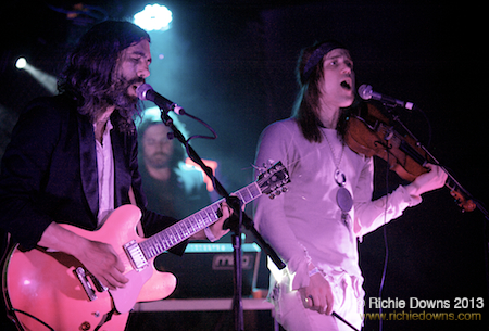 But I wasn’t about to let an A.merican D.ream–or a deluge accompanied by a tornado warning–curb my excitement at seeing Vietnam do their thing at the Rock & Roll Hotel. Unfortunately I missed the opening act due to a bout of gastric distress–I made the foolish mistake of stopping by Burger King on my way to the show to sample their new BTO Classic, only to discover afterwards in the fine print the meat contained within listed as “Randy Bachman”–but arrived just in time to see Vietnam, which in addition to Gerner on vocals and rhythm guitar includes Nathaneal “Lefty” Maynard on lead guitar, Christian Havins on Moog, Gabe Bishop on bass, Christopher Anderson on violin, and Sweet Joey on drums, setting up their equipment.
