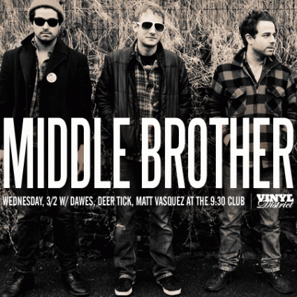 Middle Brother, the folk-rock supergroup featuring John McCauley (Deer Tick), Matt Vasquez (Delta Spirit), and Taylor Goldsmith (Dawes) will be playing 9:30 Club tomorrow after releasing their new album today, and you’ve got a chance to win a pair of tickets to see them.