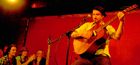 The combination of a small third-story room and a sold out crowd made for a very intimate performance setting as the audience faced the fully tattooed and slightly sweaty Whitmore, on stage armed with no backing band, but only with a guitar, banjo, and bass drum.