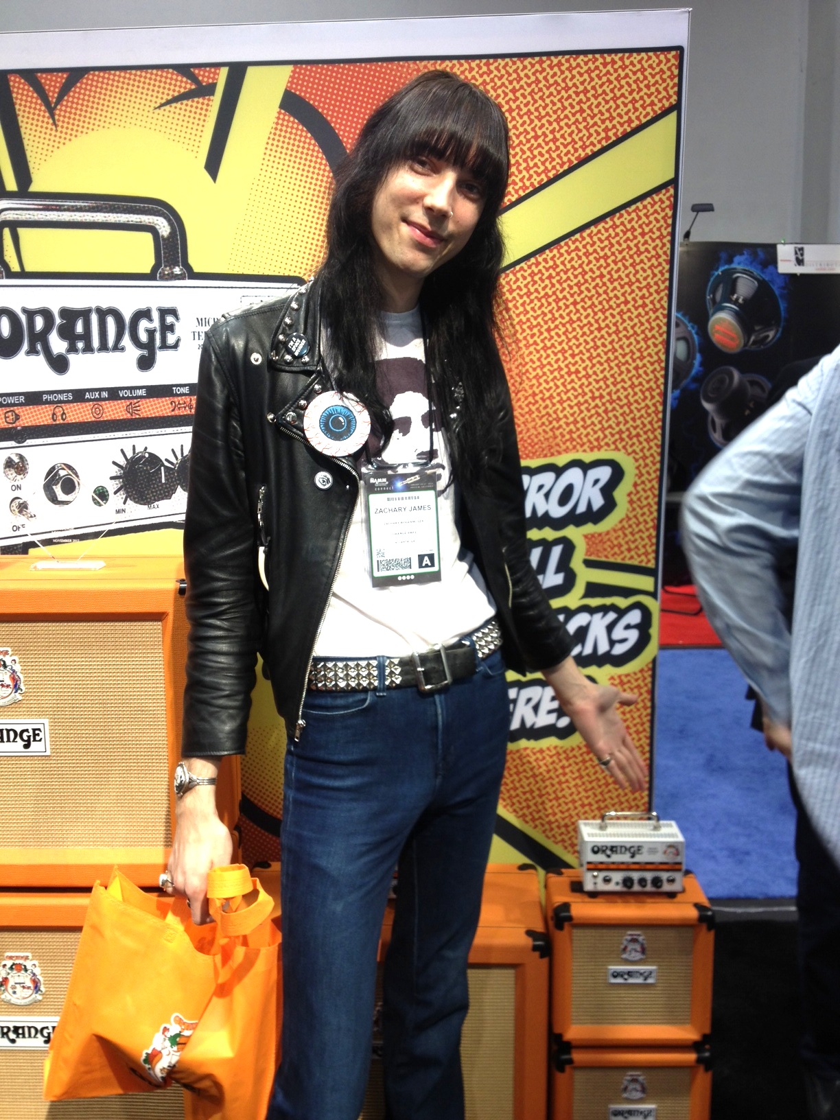My guitarist and main man Zachary James (who plays both in my band, Alexandra & The Starlight Band, and his own band Zachary James & The All Seeing Eyes) is a proud Orange Amps endorsee, so of course we had to pay a visit to the Orange booth. Zachary is a classic British (-looking) rocker, and Orange Amps are classic, British, and rock. (Check out his artist profile.) Zachary has used his black Orange amp half stack on every kind of stage from punk rock dive bars to Lil Wayne’s I am Still Music Tour and loves his girlfriend. (His amp, that is.)