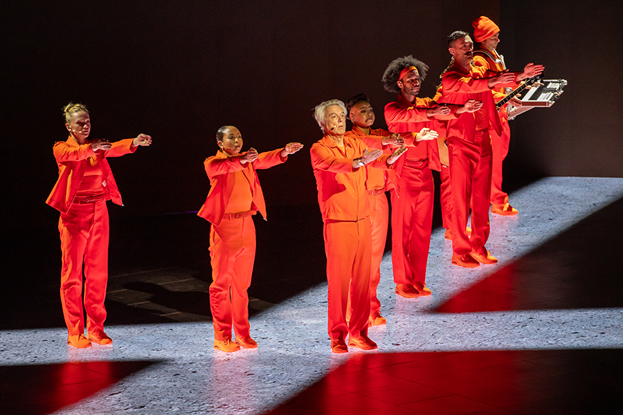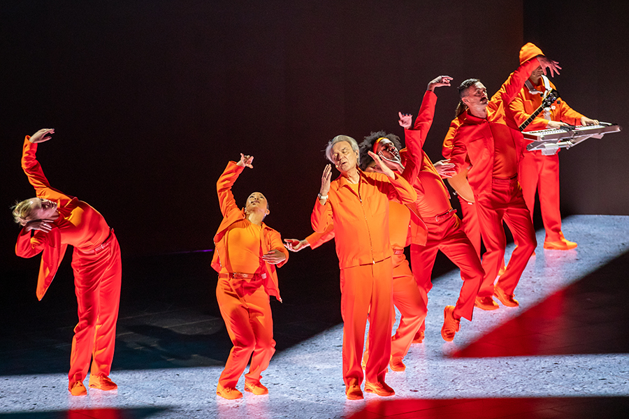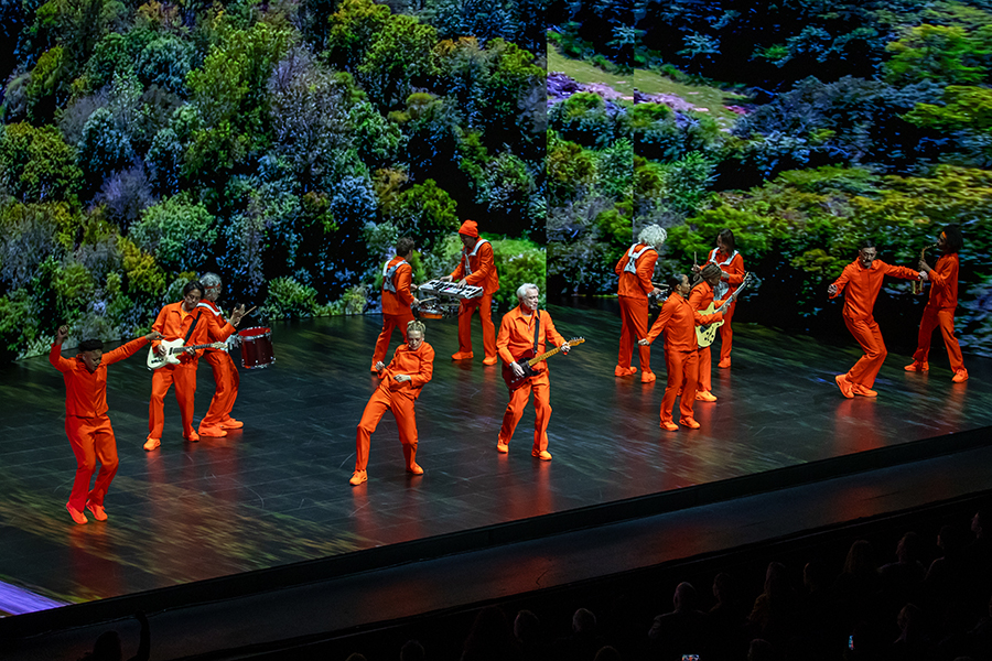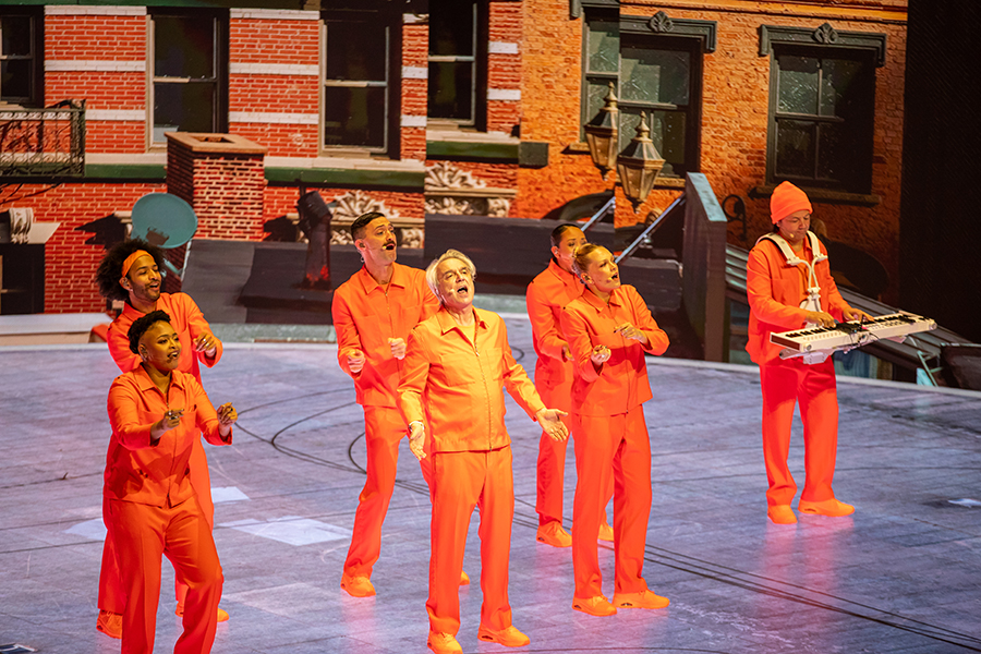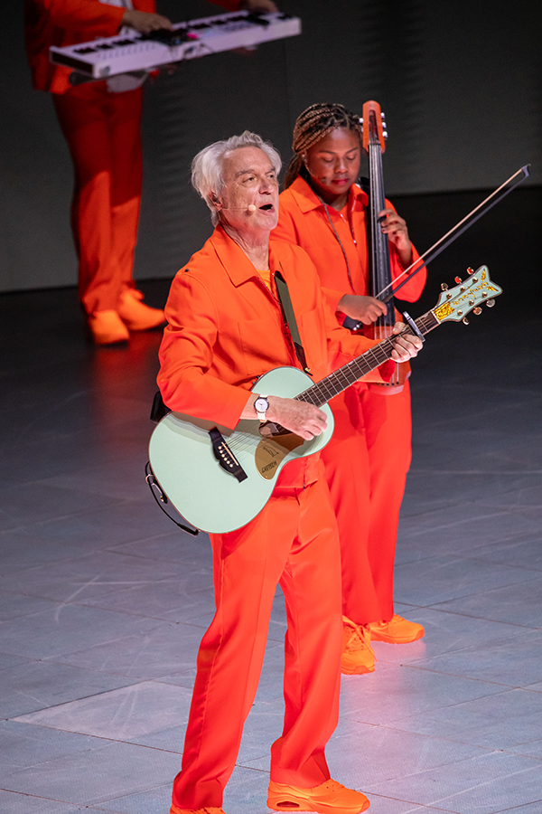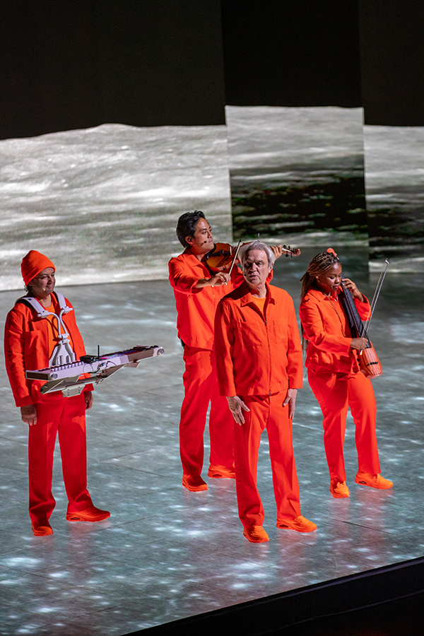 Coming out in head-to-toe orange outfits, Byrne performed a beautiful acoustic rendition of “Heaven” with three other members of his entourage. A stark image of the moon served as the backdrop on the floor-to-ceiling high-definition video screen.