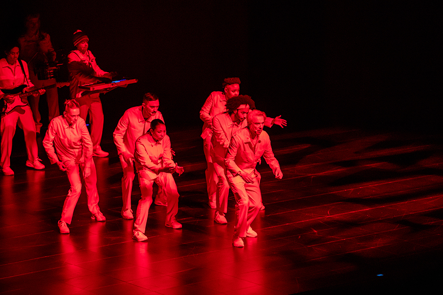Following that was an explosion of people, sound, and visuals; more and more members of the show entered the stage, singing, playing, and, most of all, moving. The man who was once known for running all over a stage while others played was now part of a democratic swirl of performance as drummers, singers, dancers, a guitarist, and a bass player all got their moments to shine individually and within the entire ensemble, overcoming the monochromatic nature of the outfits. (They have also been all blue at other shows.)