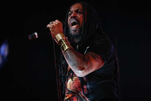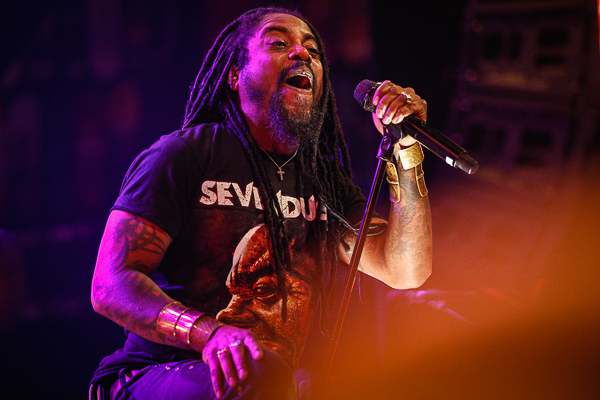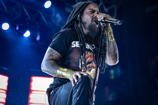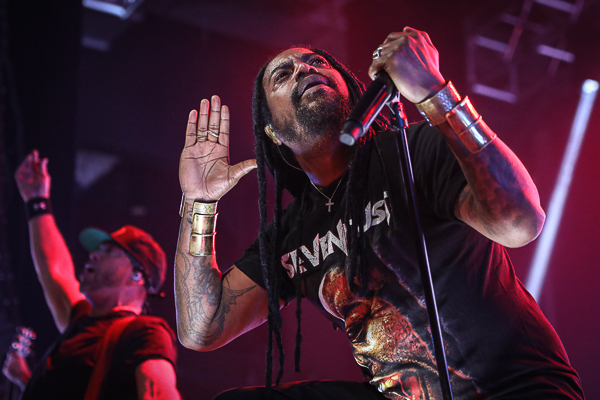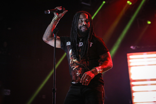 Dope took the stage led by frontman Edsel Dope and played a short but ferocious set of powerful metal anthems fueled by piss and vinegar. The set kicked off with the recent “Blood Money,” then you got all the Dope hits you would expect and the crowd was intensely giving Edsel tons of energy as they sang every word. With Acey Slade on guitars for this tour, the band delivered “Bitch” as well as the medley “Die, Boom, Bang, Burn, Fuck” which gave you a little of all your favorite Dope songs. The band ended the set with the Dead or Alive cover “You Spin Me Round (Like a Record).” Now half-way through the night band-wise, the crowd was PUMPED for Sevendust.