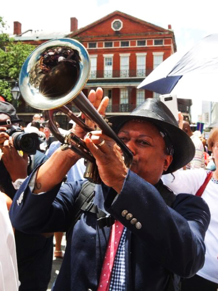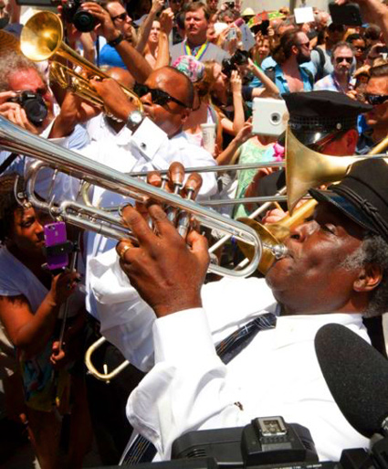 The waiting crowd included surprised tourists, local music lovers, face and body-painted French Quarter characters, sign and banner bearers, and dozens of photographers. Trumpeter Kermit Ruffins (pictured above) joined in almost immediately adding high note blasts to those of James Andrews on the first number.