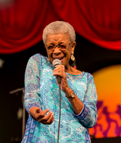 Germaine Bazzle (pictured below) spent much of her career as a music teacher. Now retired, she plays out much more often and her set in the Jazz Tent displayed the joyous disposition of one of New Orleans’ greatest vocalists.