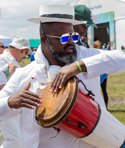 The musicians, one of whom is pictured below, played and sang as they demonstrated a celebration that has much in common with the second line and Mardi Gras Indian culture of New Orleans. Of course, that was the point of selecting Cuba as the featured nation in the first place.
