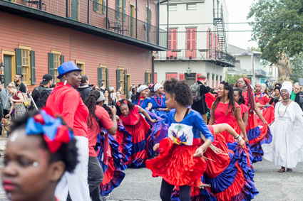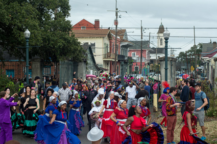 Members of the Pres Hall band, Butler and Chassagne, joined the group for the finale. At that point the day which had begun with a procession (pictured below) featuring numerous dancers, maskers, two brass bands, an African drum troupe (leading the Northside Skull and Bones Mardi Gras group), and more Haitian musicians, was reaching a fevered pitch. The rain held off and the conjoined group of musicians from New Orleans and Haiti (Chassagne grew up in Canada) paraded off into the setting sun to continue the party late into the night in true New Orleans fashion.