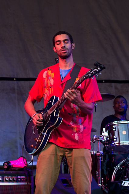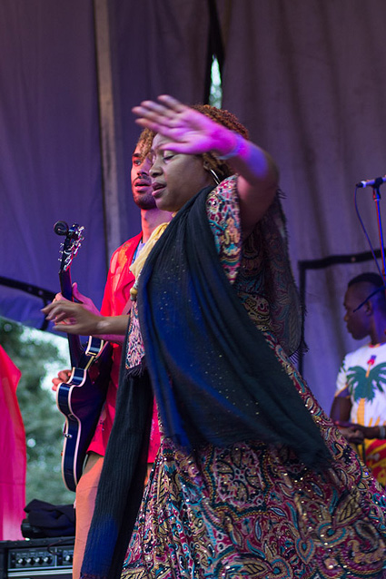 The lead guitarist played lines that would not have been out of place in a soukous band from the Congo. His work on the wah-wah pedal helped amp the already excited crowd. The bass player and drummer had much of the crowd dancing frentically. At the back of the stage, a pair of musicians played rara horns, a traditional instrument of Haiti’s street parades. At the end of the set, they came front and center and led the band off the stage.