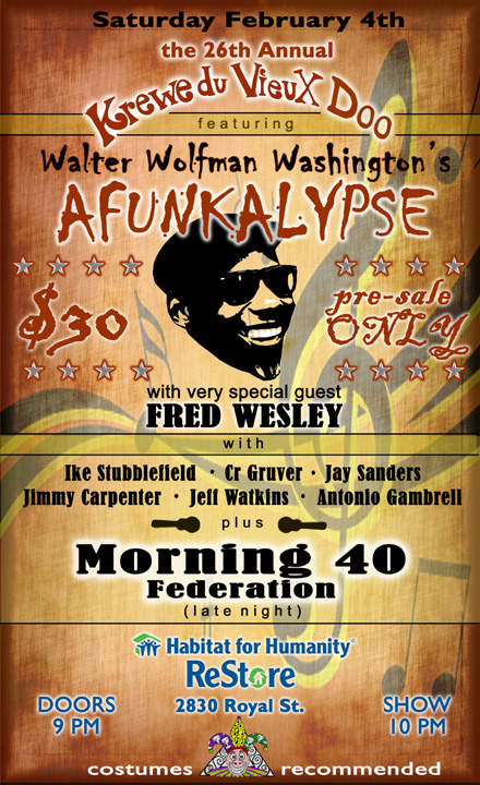 TVD is proud to be the first to bring you the entertainment lineup for this year’s Krewe du Vieux ball! The 26th annual Krewe du Vieux Doo will feature a super group called Walter “Wolfman” Washington’s Afunkalypse! Led by New Orleans’ favorite guitar slinger, the group also includes killer players like Ike Stubblefield on B-3 organ, CR Gruver on keys, Jeff Watkins and Jimmy Carpenter on saxes, Antonio Gambrell on trumpet and Jay Sanders on bass.