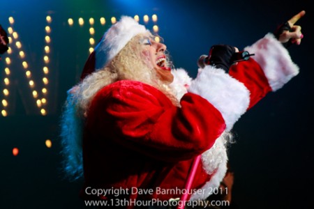 The nearly two hour set included a Twisted Santa Claus factory, crazy elves, smoking hot reindeer, snow machines, a giant Ozzy Osbourne statue, and all five original members of Twisted Sister. Dee Snider dressed as Santa entered on a sleigh pulled by scantily clad reindeer, giving presents to all the naughty boys and girls in the audience, in the form of condoms and candy canes pulled from a big red sack.