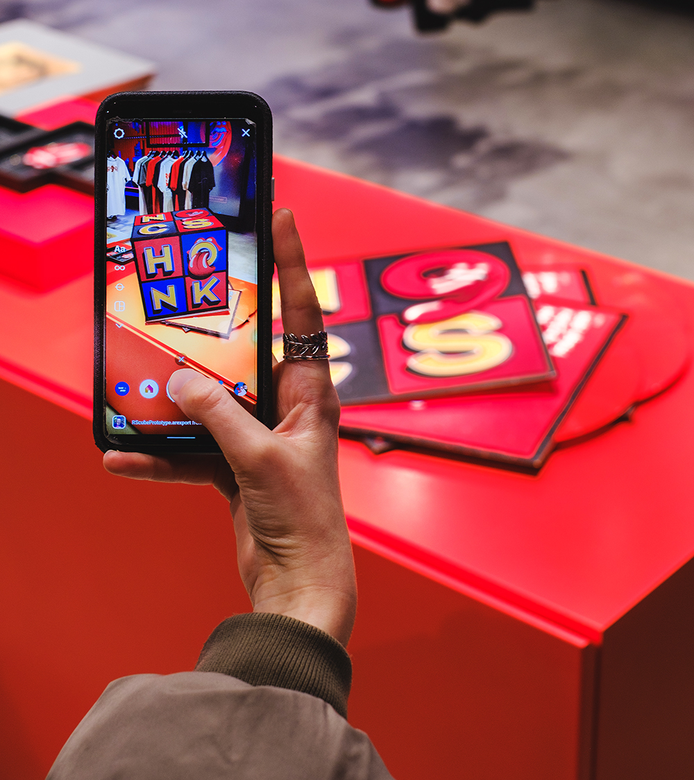 Sound, vision, and lighting are key store components. Five, 90 inch portrait screens display a film made exclusively for the store showing footage across the rich history of the band. Speakers from high end British audio brand Bowers & Wilkins will play tracks from the greatest rock ‘n’ roll band in the world. The store also features a bespoke T-shirt customization station—choose from an array of exclusive designs on the touch screen menu to create something unique.