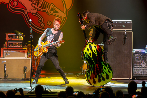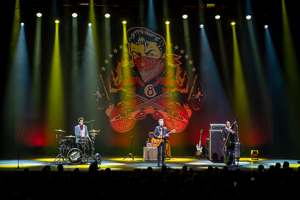 A bit of heckling from the back of the theater from folks who apparently didn’t feel that a show with “riot” in its name should involve seats went unnoticed by Setzer as he brought the band back to finish out the set with a trio of Stray Cats tunes that got the crowd on its feet and singing along.