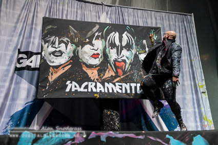 Performance painter and the evening’s hype man David Garibaldi warmed up the crowd with some brushes and a couple of buckets of paint, transforming three huge black canvasses into rock and roll art as the music blasted. The arena was packed to the rafters when the curtain finally dropped, as Paul Stanley, Gene Simmons, and Tommy Thayer were lowered to the stage to “Detroit Rock City” as both the pyro and the crowd went off.