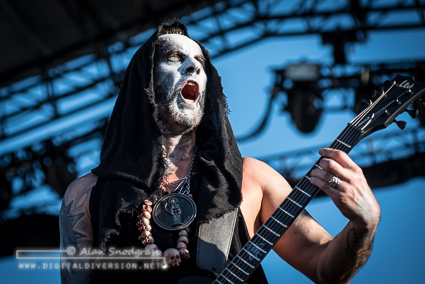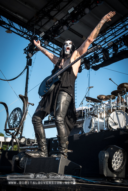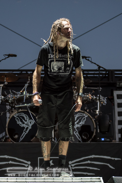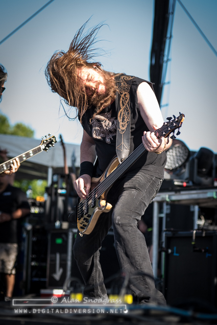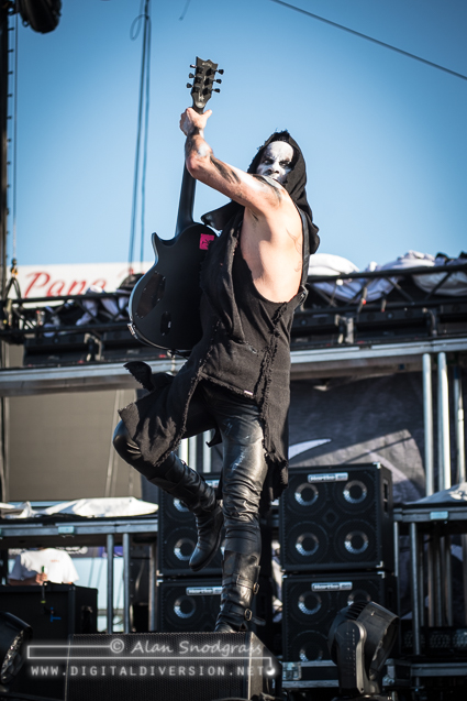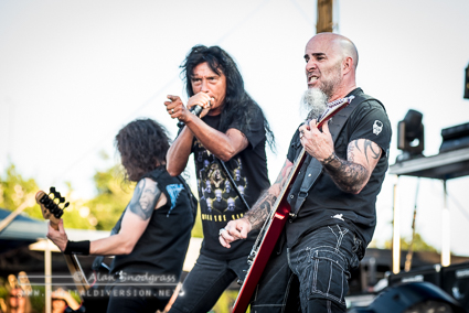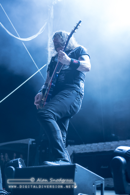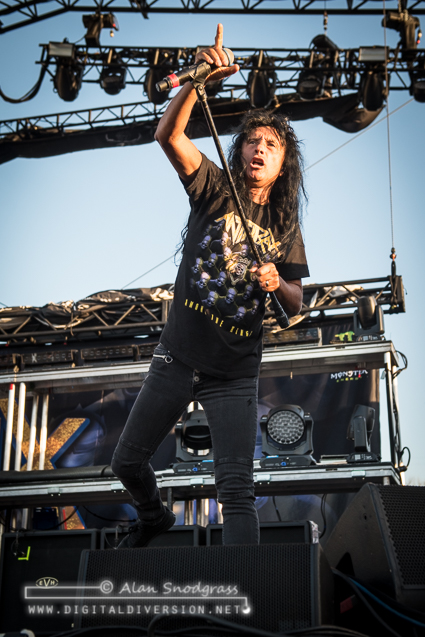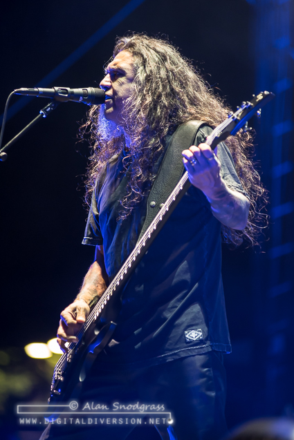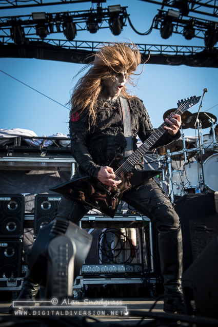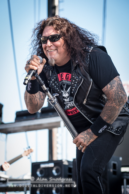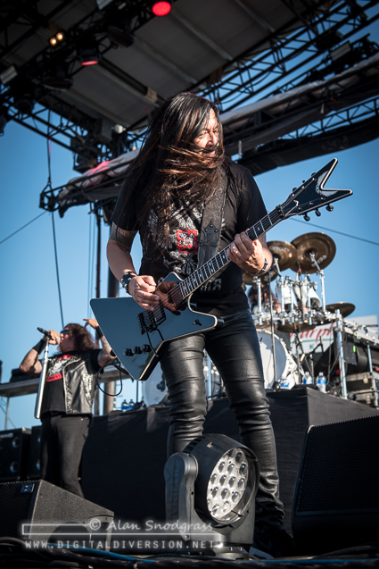 The Sacramento tour stop seemed to get off to a rocky start with Testament’s opening slot being pushed from its original set time to 5:55 pm. Then, as the crew raised the Testament’s backdrop as the band was about to take the stage, the banner became untied and fell where the crew quickly snatched it up. Testament carried on regardless and delivered a crushing set to start the day.
