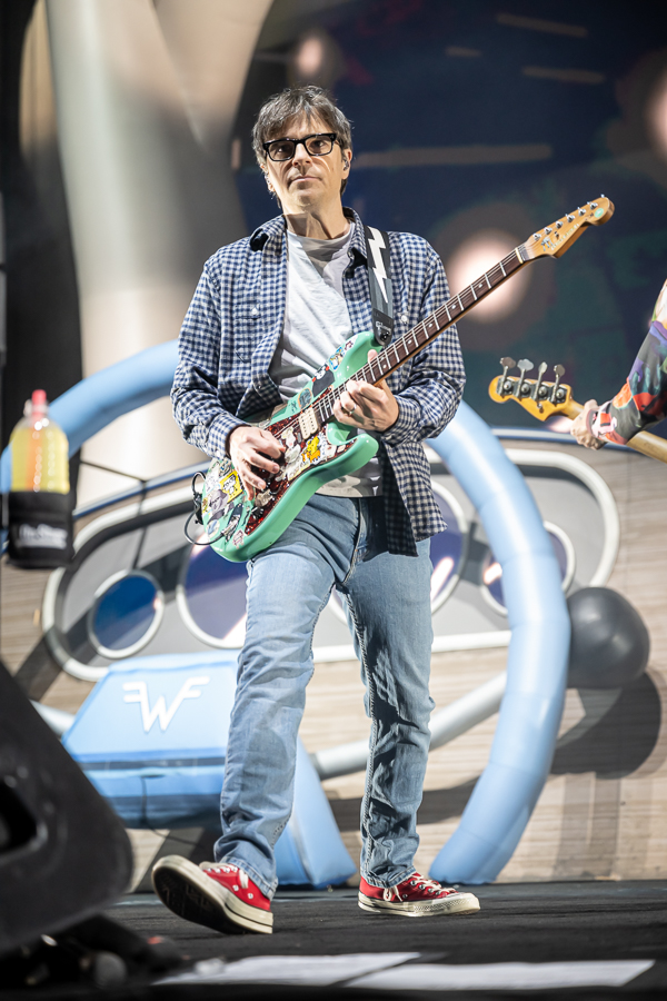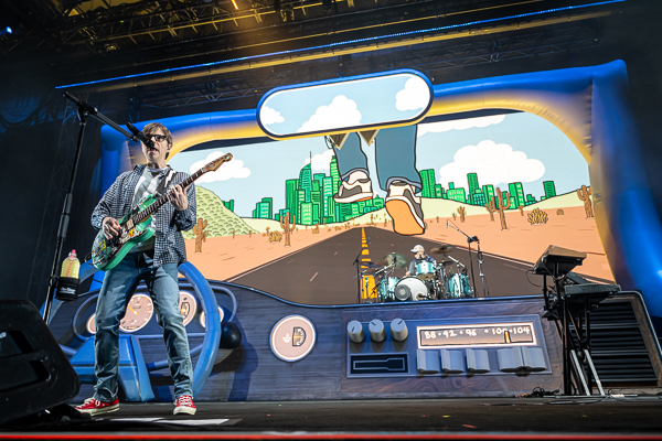 Weezer finally took the stage at a quarter past 8 with the crew yanking down the curtain that hid the back half of the stage revealing the drum riser set atop a massive car dashboard with LED screens as its windshield and gauges. Over-the-top stage, even by Weezer standards! From there the band weaved their way between the classics and rarities for what would prove to be a perfect evening of nerd rock.