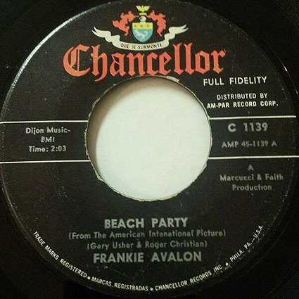 “Don’t Stop Now” can hold its own amongst the innumerable great garage rock songs of the era, from its mean and fuzzed out guitar to the fellas what echo Frankie’s cries of “Don’t stop now!” A couple of the songs on the Beach Party soundtrack featured Dick Dale and the Del Tones, but “Don’t Stop Now” isn’t one of them, and I’ve searched in vain for the genius who abuses his guitar on the song. “Don’t Stop Now” was co-written by Russell Faith, the same fella who co-wrote Avalon’s 1959 hit “Bobby Sox to Stockings,” but that’s about as far as my musical archeology has gotten me.