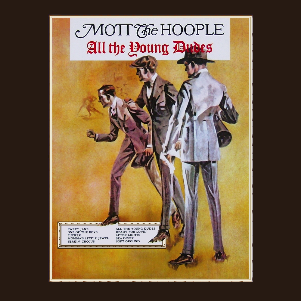 Mott the fookin’ ‘Oople—you gotta love ‘em. They were the first band I ever sang along with in front of the mirror, imaginary microphone in hand, checking out my rock star moves. The song was “All the Young Dudes,” of course, and the album bearing the same title belonged to my oldest brother, who was the closest thing my tiny hometown had to an actual glam rocker; he glammed up a couple of pairs of stacked-heel shoes with sky-blue paint and glitter, and actually walked around in them, which took balls in a place where shoes like that practically screamed fag and Grand Funk Railroad was considered avant-garde.
