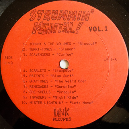 A solid dose of the Strummin’ Mental discs helped put the kibosh on that mentality in forthright fashion. The first volume collected nineteen concise and ripping slabs from names like The Renegades, The Bounty-Hunters, The Scavengers, The Invaders, The Rhythm Rockers, The Jokers, Johnny & the Volumes, and Rick & the Fairlanes, the anonymity of the whole lot helping to greatly illuminate the fundamental necessity of it all.