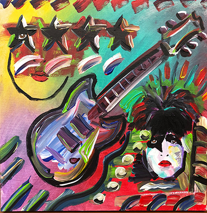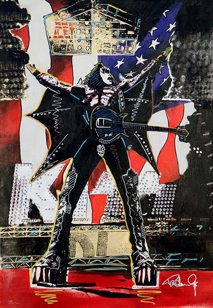 His gallery shows draw a number of fans, of course, but also viewers who may have never heard “Love Gun.” His original paintings, mixed-media works, prints, and hand-painted sculptures often sell out, and not just because he also makes personal appearances, as he will September 21 and 22 in the Washington, DC area at the Wentworth Galleries in Bethesda and Tysons Corner.
