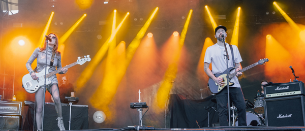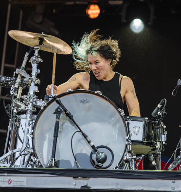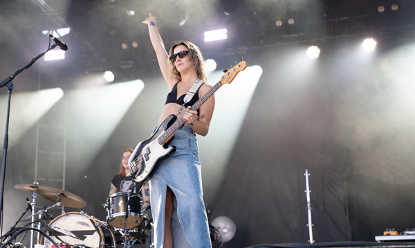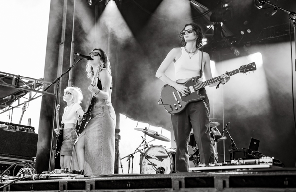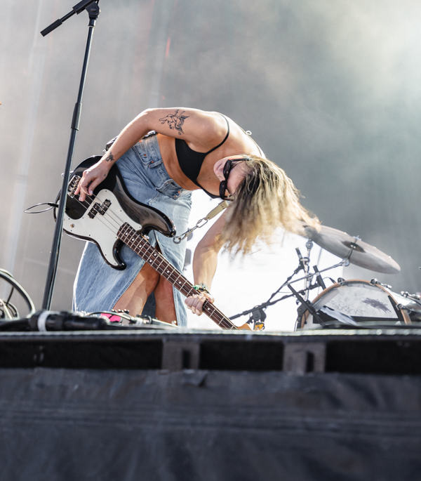 2:50 PM: Bully took to Home Plate while the sun was high on the crowd. Bully is the solo project of songwriter and guitarist Alicia Bognanno. Alicia plays with a band mixing hip-hop and rap with grunge influenced tones. Bully is very upbeat, creating momentum for the festival as the day went on. Alicia has been releasing music since 2013, and most recently released an album Lucky for You in 2023. Bully’s sound is a throwback to the ’90s, mixed with a more modern, alternative sound. With the pairing, the group has a wide range of fans.