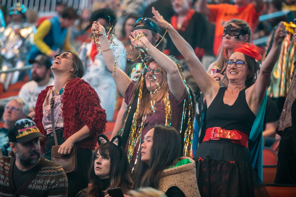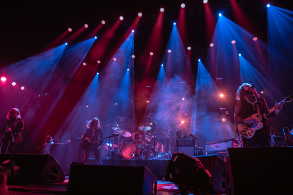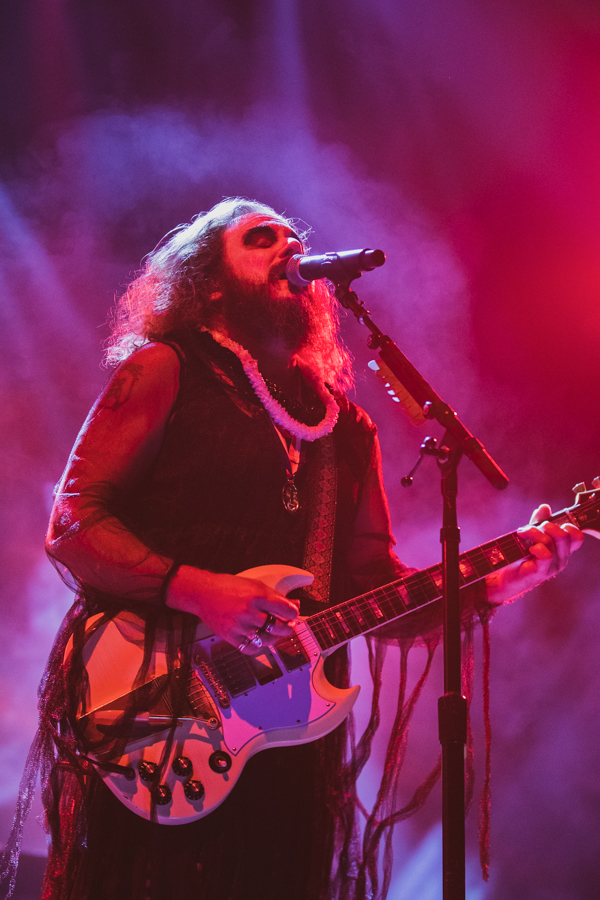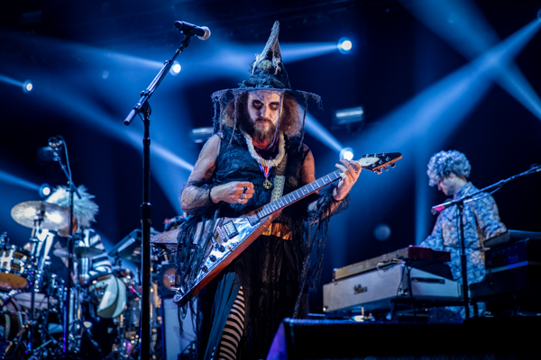 Singer and guitarist Jim James was aptly dressed as a witch, a costume that perfectly suited him. Guitarist Carl Broemel jammed out as a skeleton; bassist Tom Blankenship’s Eddie Munson (from Stranger Things) mullet majestically flowed; and drummer Patrick Hallahan was an animated Beetlejuice. But it was keyboardist Bo Koster who got my vote for favorite costume—perhaps because it was the most surprising. Of all the fan speculation about what the band would dress as, did anyone guess that Bo would roll out as Mama from Mama’s Family?!