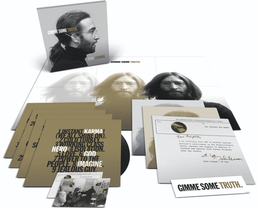 GIMME SOME TRUTH. will also be released as a 19-track CD or 2LP, a 36-track 2CD or 4 LP, and several digital versions for download and streaming including in 24 bit/96 kHz audio and hi-res Dolby Atmos. The vinyl was cut by mastering engineer Alex Wharton at Abbey Road Studios. The Deluxe Edition and 4LP formats will include a GIMME SOME TRUTH. bumper sticker, a two-sided poster of Lennon printed in black and white with silver and gold metallics, and two postcards, one of which is a replica of Lennon’s letter to the Queen of England in 1969 when he returned his MBE in “protest against Britain’s involvement in the Nigerian-Biafra thing, against our support of America in Vietnam and Cold Turkey slipping down the charts.” The 2LP and 2CD will also include the poster and all versions will come with a booklet filled with photos and the MBE letter.
