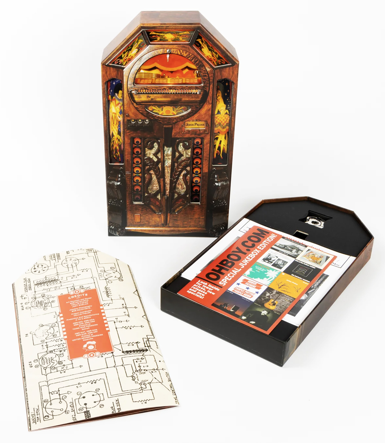 Modeled precisely after Prine’s 1935 Wurlitzer Jukebox, the collection features the eight singles Prine released throughout his career on Oh Boy Records packaged in their original artwork as well as working lights that illuminate the jukebox, a booklet with a forward written by Jim Rooney, two “Handsome Johnny” jukebox coins, a vintage Oh Boy catalogue and more.