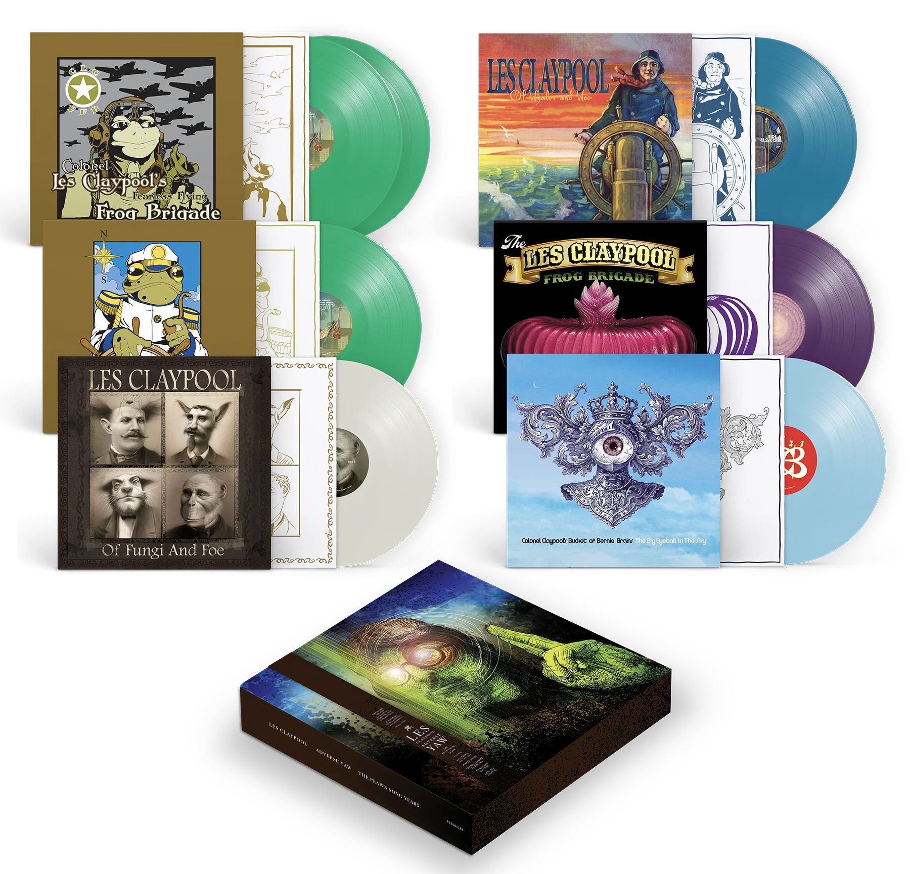 The 5-album collection will include Live Frogs Sets 1 & 2, the sought-after Purple Onion, Of Whales & Woe, and Of Fungi & Foe LPs. Listeners will also experience The Big Eyeball In the Sky, now available with remastered audio on limited edition, colored 180-gram vinyl. Bundle options include an exclusive t-shirt and a limited-edition screen-printed poster, designed by Matt Leunig. The Adverse Yaw: The Prawn Song Years Box Set is now available for pre-order at Club Bastardo.