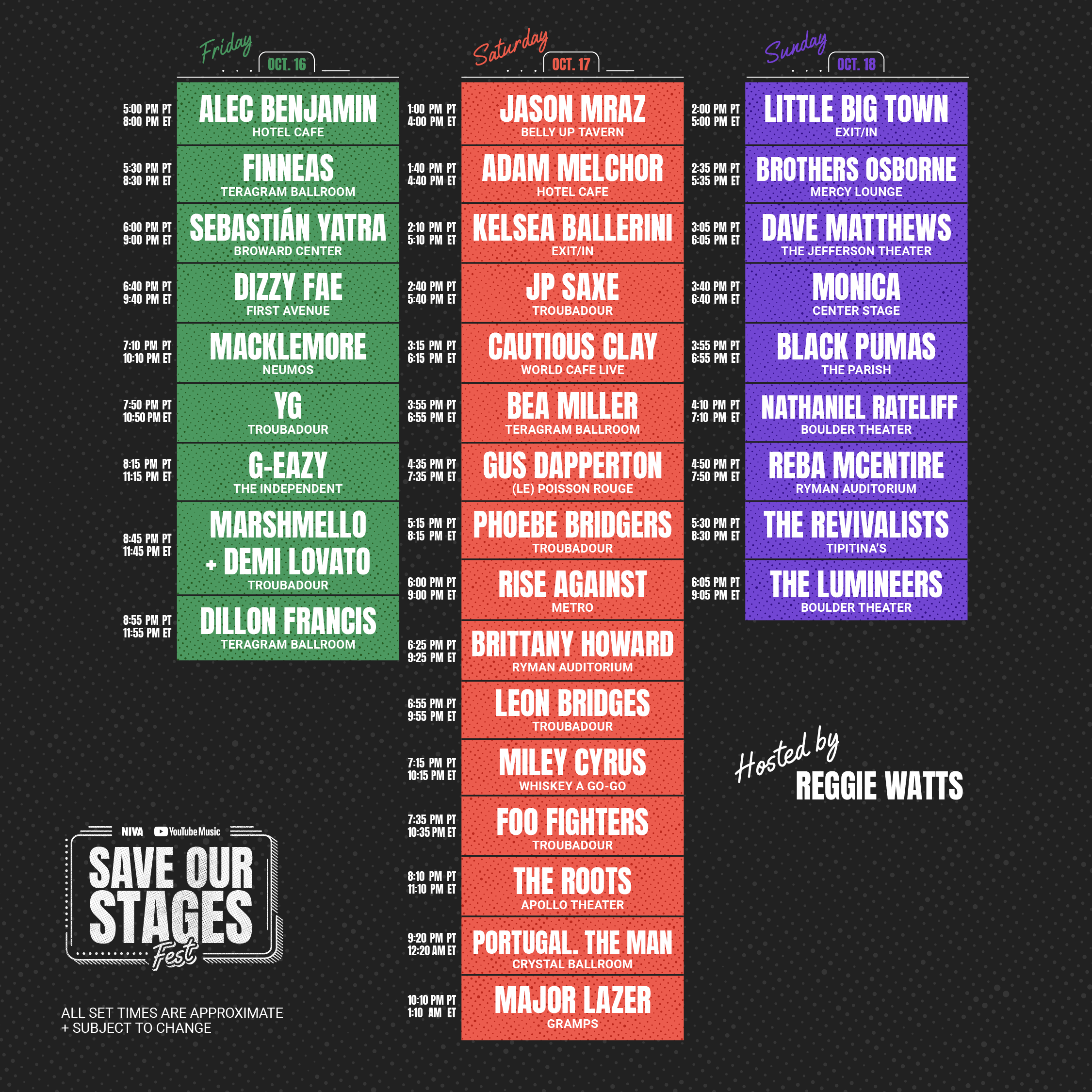VIA PRESS RELEASE | YouTube Music and the National Independent Venue Association (NIVA) today revealed the schedule for this weekend’s Save Our Stages Festival (#SOSFEST), a three-day virtual music festival featuring all original content on Friday, October 16 through Sunday, October 18.