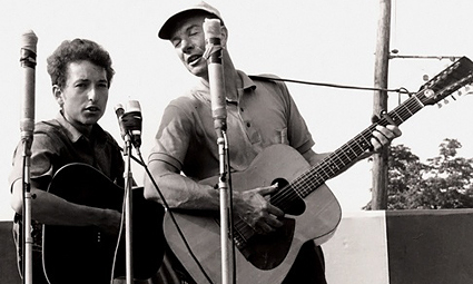 For many years I believed Ol’ Pete was one of those uptight folkies who tried to “unplug” Bob Dylan at the Newport Folk Festival in ’65. Calling young Dylan a “traitor” is not exactly a cool “idelic move.” True that the story is more folklore than fact, and now close to fifty years after that summer evening at Newport, Pete has left us.
